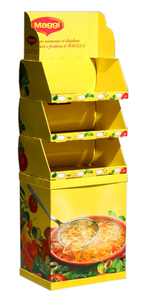 Production of promotional floor displays with unique design and full color offset printing. They are made of individual modules, easy to assemble and can bear a large weight, distributed evenly on the structure. They are used to display a large number of products, and can occupy a variety of locations in retail outlets or elsewhere so that they are sufficiently visible and convenient to use. Access to products may be from one, two, three, four sides.